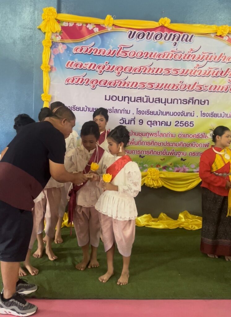 ในวันที่ 9 ตุลาคม 2565 สมาคมโรงงานสกัดน้ำมันปาล์มร่วมกับกลุ่มอุตสาหกรรมน้ำมันปาล์มได้จัดกิจกรรมเพื่อสังคมโดยเติมความสุขสู่สังคมด้วยการร่วมบริจาคทุนการศึกษาให้โรงเรียนในจังหวัดบึงกาฬ จำนวน 300,000 บาท โดยมอบให้โรงเรียนละ 100,000 บาทประกอบด้วย โรงเรียนชุมภูพรโส่ก่าม โรงเรียนบ้านโนนม่วงและโรงเรียนบ้านหนองจันทร์ ซึ่งเป็นโรงเรียนเล็กๆ มีนักเรียนทั้งโรงเรียนประมาณ 30 กว่าคน ซึ่งเป็นนักเรียนเหล่านี้เป็นนักเรียนด้อยโอกาสในถิ่นทุรกันดารในจังหวัดบึงกาฬ